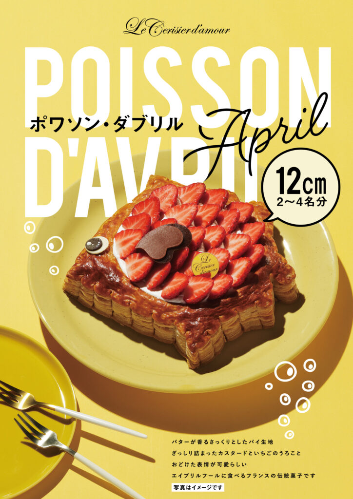 ポワソンダブリル(4/1販売開始)バターが香るさっくりとしたパイ生地 ぎっしり詰まったカスタードと苺のうろことおどけた表情が可愛らしい エイプリルフールに食べるフランスの伝統菓子です! 4/1~4/15までの期間限定販売 各店舗数量限定で販売しますのでご利用店舗へ直接お問い合わせください! ※写真はイメージです実際とは異なる場合がございます。